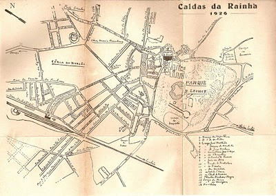 A propósito dos folhetos de propaganda dos Hotéis Copa e Edem-Palace, lembrei-me deste mapa. Não me recordo se já o tinha enviado. Vem num livro antigo sobre o Hospital Termal. Conforme podes ver é de 1926, e entre outros pormenores chamo a tua atenção para a “cêrca do Burlão” (é assim que lá está escrito) e a da Maria Carolina. Vê como eram as Caldas naquele tempo, como sei que te interessas pela história das Caldas