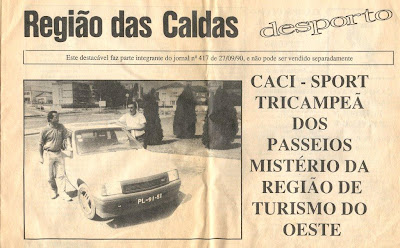 Claro que tudo isto vem a propósito porque trago hoje ao blog uma página do Jornal Região das Caldas, já desaparecido, de 27-09-90, onde dava conta das classificações do Rally Papper dos Pimpões e do Campeonato do Oeste, que era feito pelo somatório de pontos das diversas provas realizadas em Caldas, Lourinhã, Torres Vedras, Peniche, Alenquer, Cadaval e outras que variavam de ano para ano.